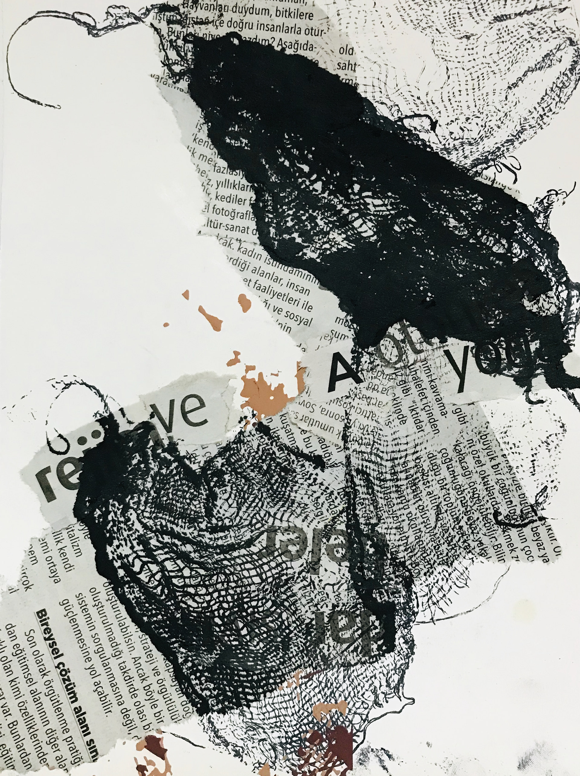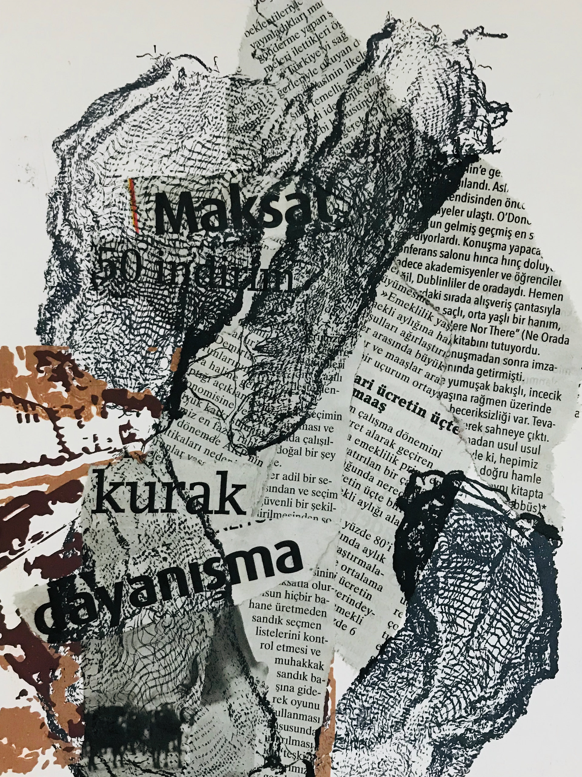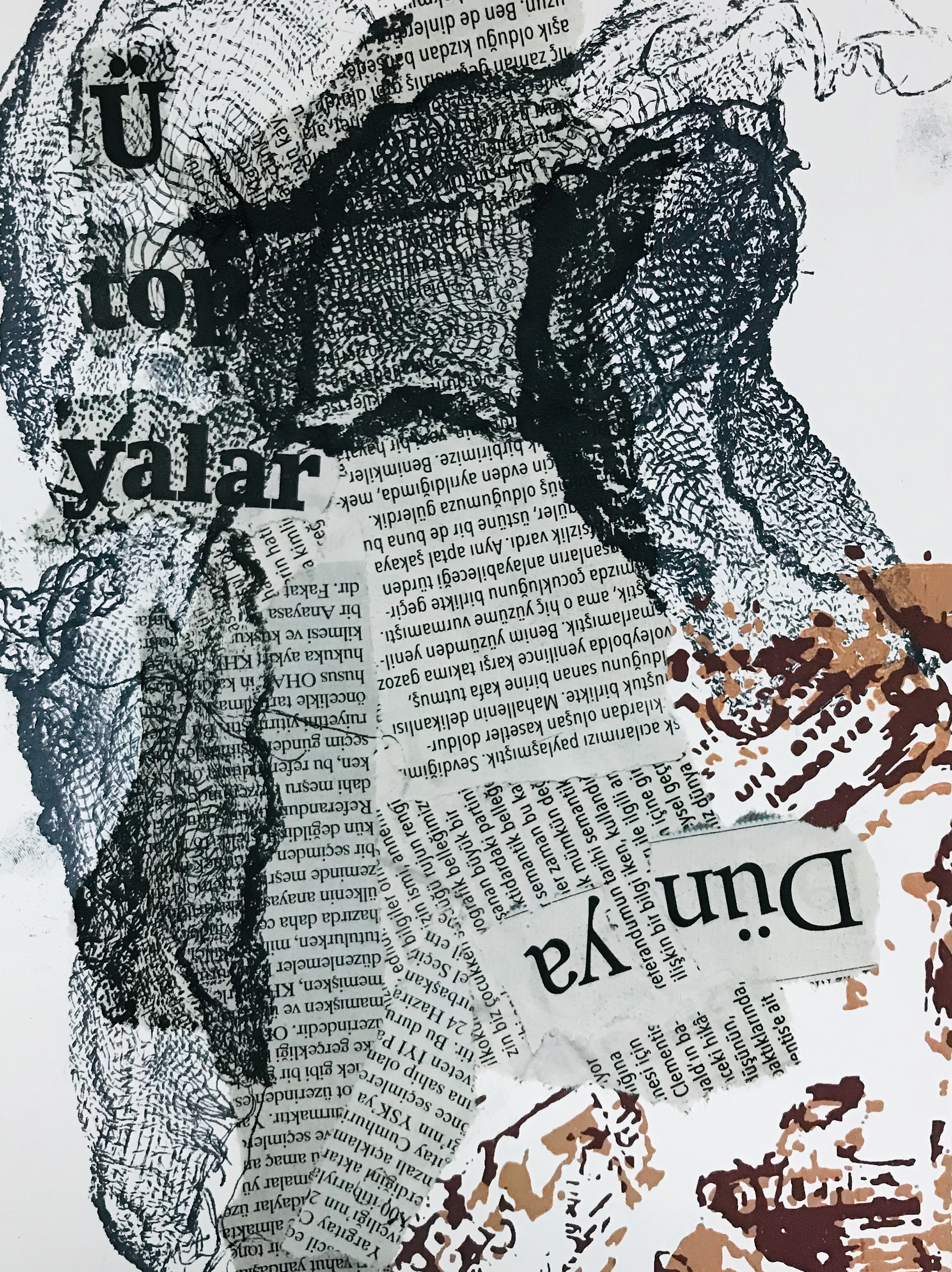 Who are the traces I left behind time is following me sometimes or leaves and leaves. Life itself is as a matter of leaving a mark concretization when we see its an inevitable is becoming part of it. Found objects and perception with selectively placed collages created work with collography, marking and printing with an unstable composition. It aims to present it to the audience. All work is now paper or your newspapers randomly found in places by composing has been created. Printing on the waste papers in his class with newspaper collages forms the ground. On top of that is the tile collography with ink stratified attempted to be created.