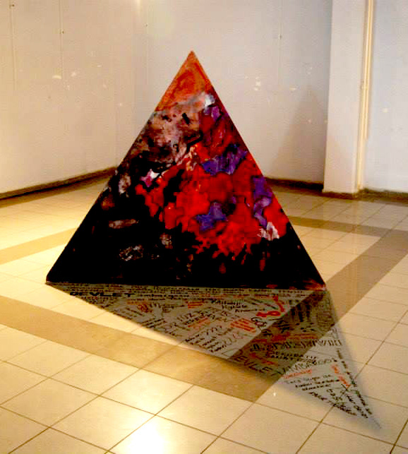 In the installation work titled “Form on the Surface – Form in Space”; The reason for the use of a triangle-based pyramid consists of a silent scream of the oppression created by men from the eyes of women. Iconographically, the straight triangle represents the man and the inverted triangle represents the woman. While the straight triangle emphasizes the celestialness of the man by keeping its pointed tip up, the inverted triangle represents the woman as terrestrial. From the past to the present, men have been referred to with features such as power, genius and talent, while women have not been able to take part in this perspective. A map of Turkey was placed on a triangle-based pyramid surface and legends were created according to the crimes women were subjected to. Red areas in exposed crimes; The highest number of femicide in Turkey, orange; wounding and finally purple areas; represents assault and ill-treatment. The parts with mixed colors in places indicate the variety of crime. The falling shadow of the pyramid, on the other hand, represents the place of women in society and their indifference. Like the pans of an equal-armed scale; As the male sex is exalted, the opposite is true for women. This creates a representation crisis. Crimes such as harassment and rape, which I would like to add to the legend, could not be reflected in the statistics because women did not complain. In our country, women say that "whoever gets through" is seen as deserved and because of the wrong approaches of the institutions to which help is sought. The rhetoric of the unchastity of the laughing woman, that the pregnant woman should not wander on the street, the state embargo on the decision of abortion, whether it is a girl or a woman, the state takes care of the child who was raped... once again brings up the legitimation of some of the negativities experienced by women by the state and their devaluation through mass media.